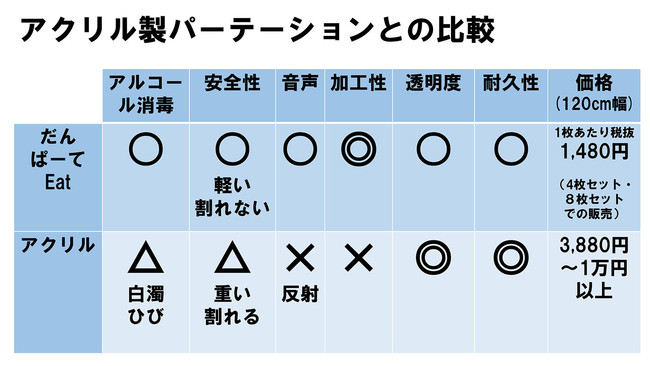 普及が最も多いとされるアクリル製パーテーションとの比較です。