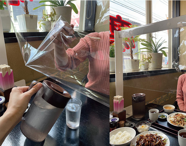 ビニールはあえて固定せずにフリーな状態の為、パーテーションの下からメニュー表や食器の受け渡しがスムーズにでき、飛沫対策と実用性を両立しています。ビニールは巻いて短くすることもできます。
