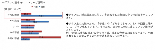 調査方法 :インターネット調査。各設問ごとに設問回答とあわせて睡眠満足度を5段階で評価。