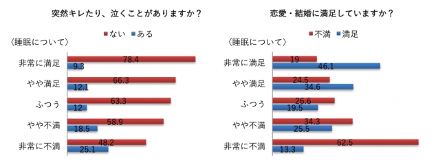 一方睡眠に非常に不満がある人で恋愛・結婚に満足している人は13.1%となり、睡眠の満足度に応じて