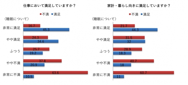 一方、睡眠の質に不満のある人で家計・暮らし向きに満足している人は11%となり、こちらも睡眠の満足度に応じて