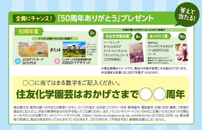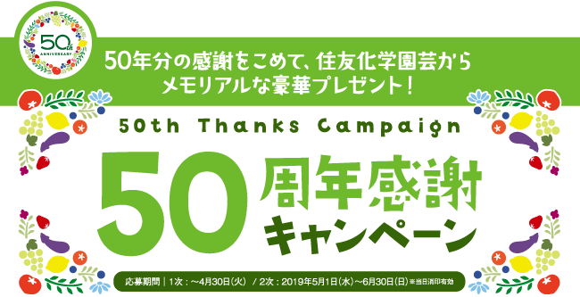 住友化学園芸株式会社(本社:東京都中央区/代表取締役社長:壇辻 寛和)は、2019年10月に創立50周年を迎えます。それを記念し50年分の感謝をこめてメモリアルな豪華プレゼントが抽選で当たる、消費者向けキャンペーン「50周年感謝キャンペーン」を全国のホームセンター、園芸店店頭をはじめ、キャンペーン専用ウェブサイト上で2月1日からスタートいたします。