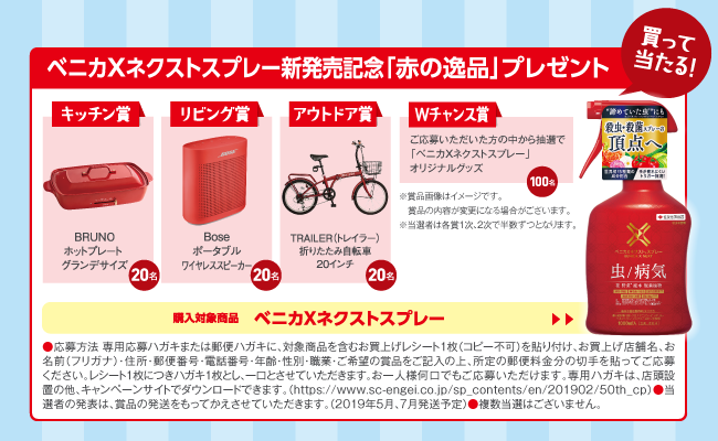 本キャンペーンは、答えて当たる!オープン型キャンペーン「50周年ありがとう」プレゼントと、対象商品を買って当たる!クローズド型キャンペーン ベニカXネクストスプレー新発売記念「赤の逸品」プレゼントの2つのコースを同時に実施いたします。