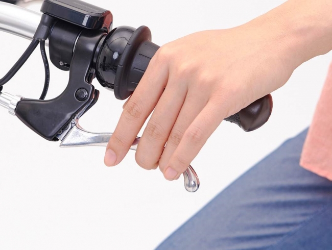 左手(後輪)ブレーキレバーを軽く引くだけで、後輪ブレーキの60%※4に相当する前輪モーターブレーキが作動。前輪と後輪のブレーキで、制動力を発揮します。下り坂や荷物が多いときでも、軽い力でしっかり減速できます。手がかじかむような寒い日や、長い下り坂でも、レバーを強く握り続けることなく、楽に減速することが可能で、力が弱い女性でも安心です。