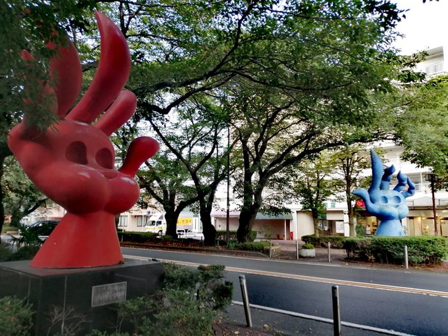 岡本太郎氏作。「呼ぶ赤い手・青い手」が目印