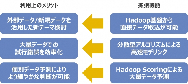 Hadoop基盤上に新しく蓄積した外部データや新規データを活用するためには、データから個別のDataMartを構築し分析を行う必要がありました。Hadoop対応版の「DataRobot」は直接Hadoop基盤から分析データを取り込んで利用できるため、従来の抽出や集計、ダウンサイジングなどのDataMart構築にかかる処理を簡素化し、これまで使えていなかったデータを使って、「新規ビジネスの創出」や「既存業務の改善」に向けた新テーマ検討を加速させます。