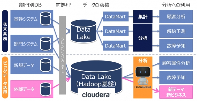 企業の業務改革や価値創造に対するAI活用の期待によりビッグデータ活用が求められる中、データを蓄積するプラットフォームとしてビジネス規模やデータ量の拡大に合わせて柔軟に拡張できるHadoop基盤を利用する企業が増えています。一方、データ分析を行う際には、データ抽出や集計する個別のDataMart(注2)を構築したうえでデータを取り込む必要があり、DataMartに取り込まれないHadoop基盤上のデータを活用しきれないという課題がありました。 Hadoop対応版の「DataRobot」は、Hadoop基盤から直接データを取り込み、Hadoop基盤の処理能力を使って分析(各種の予測モデル構築、予測処理など)を実施できます。これにより、これまで企業の中で眠っていた膨大なデータに対しても、機械学習の自動化によるデータ活用が飛躍的に進歩することが見込まれます。 今回、Hadoop対応版の「DataRobot」は、Clouderaが提供するデータプラットフォーム上での動作検証を完了しています。