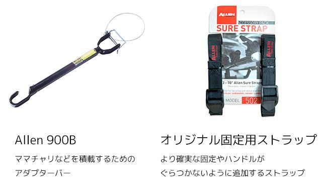 ※ママチャリなどトップチューブが無い自転車の場合は別途アダプターを取り付けます。品番「Allen 900B」 (リターンには固定ベルトやアダプターセットの物もあります。)