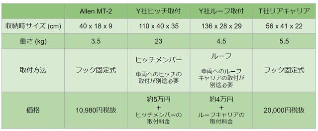 他社と比較しても取り付け方法の容易さやコンパクトならではの保管のしやすさ、そして高品質ながらも低価格を実現できているのは当サイクルキャリア、Allen MT-2のみです。
