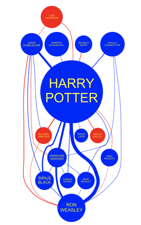 図1:言語解析、ネットワーク解析を用いた「ハリーポッター不死鳥の騎士団」における登場人物の関係図