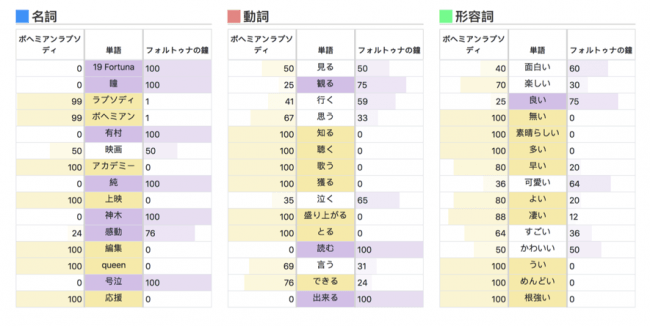 図2:映画「ボヘミアンラプソディ」「フォルトゥナの瞳」が言及されているツイート内容の特徴語解析例
