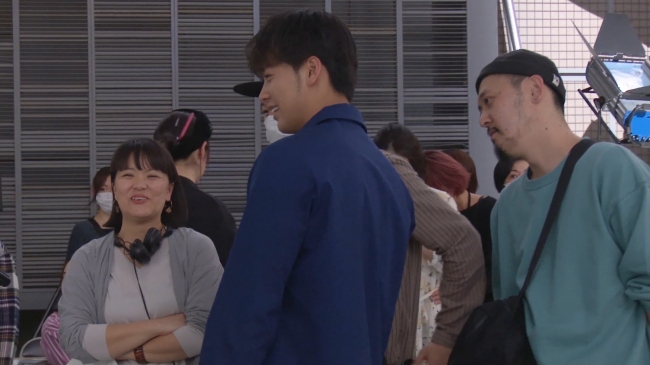 撮影現場での竹内さんは、1カット1カットの演技を気にかけていて、常に制作チームと細かな仕草や、演技の確認をしていました。また、監督と相談し、より自然でコンセプトにあった動きを提案するなど、真剣な顔を見せる一面もありました。台詞を何度か言う場面では、スタッフと言い方を真似しあうなどおちゃめな一面もあり、撮影は終始暖かな雰囲気で進みました。