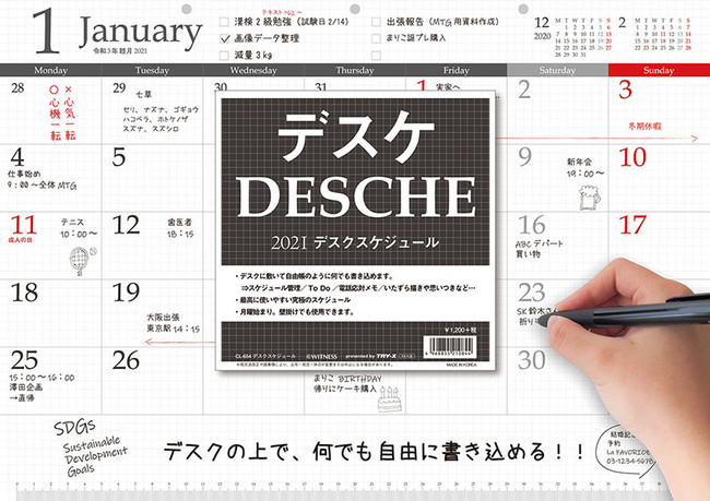 そして、弊社新商品であり、欧米のオフィスワーカーの間でも大人気の「デスクスケジュール」は、デスク上に置き、思いついた事・メモ等好きなことを自由に書き込めるカレンダーとなっている。