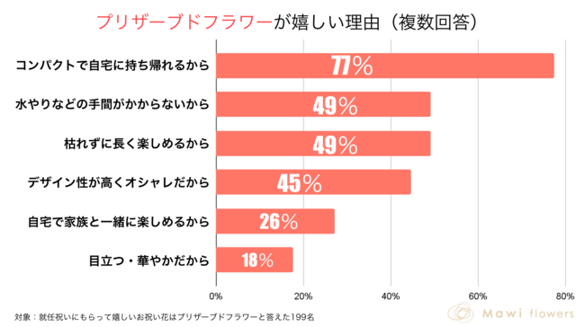 - 理由として「プリザーブドフラワーは持ち帰ることができる」を挙げた人が約8割。「水やりの手間がかからない」「デザイン性が高い」なども半数以上が選択。
