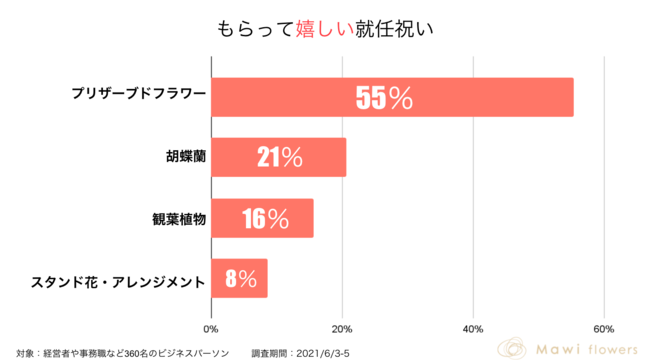 - もらって嬉しい就任祝い1位にプリザーブドフラワーを選択した人が半数以上を占める結果に。