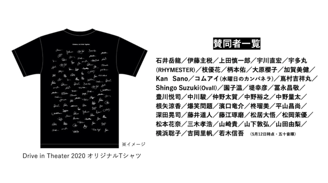 ご賛同いただいた皆様には手書きサインを頂戴し、現在実施中のクラウドファンディング内のプラン1つである「Drive in Theater 2020 オリジナルTシャツ」にレイアウトさせていただきます。このオリジナルTシャツに寄せられた資金は、アイテムの原価・梱包費・送料を差し引いた金額を、ミニシアター支援を行うクラウドファンディング「ミニシアター・エイド基金」と、世界保健機関(WHO)および国連財団による「COVID-19連帯対応基金」に対して寄付をいたします。