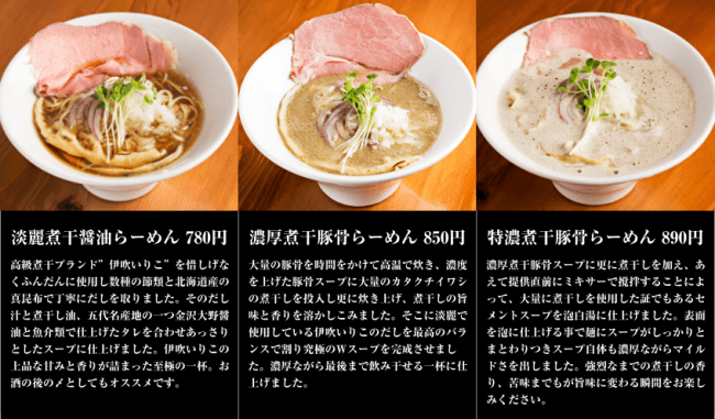 3種類のラーメン一つ一つがしっかりとした個性を持ち、高いクオリティで仕上げられている。