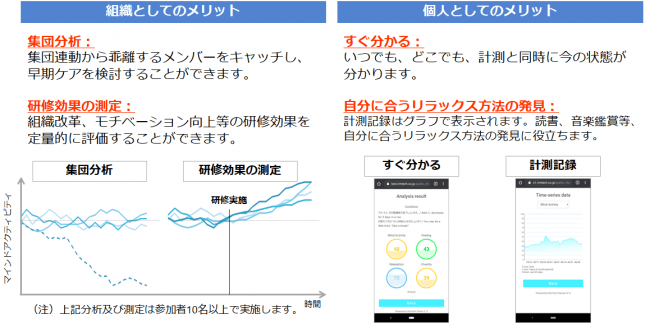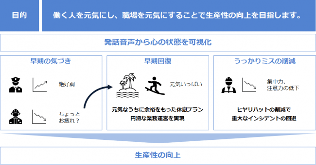 声だけで心の状態を可視化する「マインドヘルス計測システム」を用いて、メンタルヘルスの不調及び関連リスクを早期に予測するモデル開発に向けたデータの収集及び分析を行う。