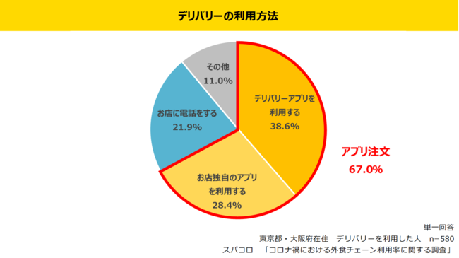 デリバリーアプリとお店独自のアプリ利用の合計は67.0%となり、2/3のデリバリー注文がアプリで行われており、アプリでのデリバリー注文がスタンダートとなってきていることが分かります。
