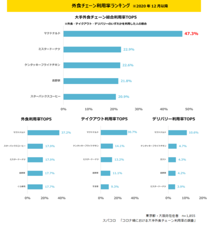 大手外食チェーン各社の外食・テイクアウト・デリバリーのそれぞれの利用率を調査。全ての利用方法でマクドナルドが他社を引き離し1 位という結果となりました。