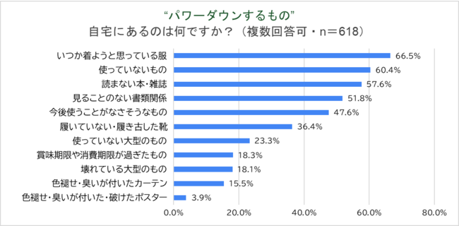 幸運を呼び込むんだ状態で新年を迎えるために、捨てておきたい “パワーダウンするもの”はあるのか聞きました。3人に2人が「いつか着ようと思っている服」(66.5%)と回答し、最多でした。以下、「使っていないもの」(60.4%)、「読まない本・雑誌」(57.6%)、「見ることのない書類」(51.8%)となり、半数以上の人が、現在活用していないものを自宅に置いたままの状態であることがわかりました。