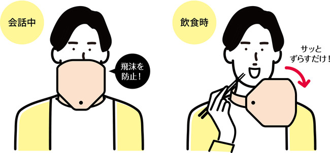 「おくちばん」は、お口の前に紙製の「板」を置き、食事の際は左右へスライド、会話の際はお口の前に戻すことができる可動式紙製マスクです。その為、向かい合っての食事でも一定の飛沫防止ができる商品となっております。