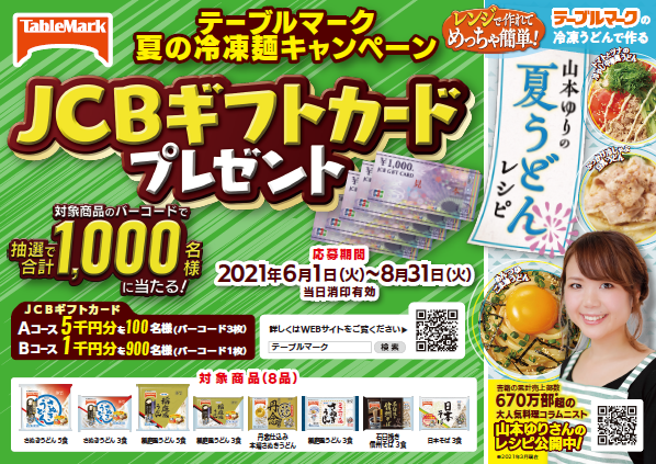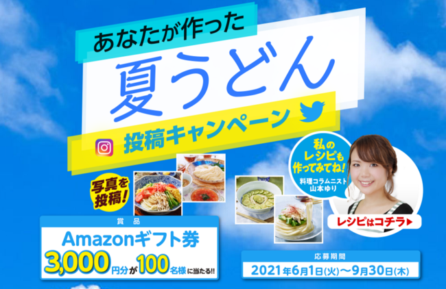 また、レシピ公開に伴い、JCBギフトカードが合計1,000名様に当たる「夏の冷凍麺キャンペーン」を実施します。同時にTwitter、Instagramでは、夏うどんの写真を投稿してAmazonギフト券が100名様に当たる「あなたが作った夏うどん投稿キャンペーン」を実施します。