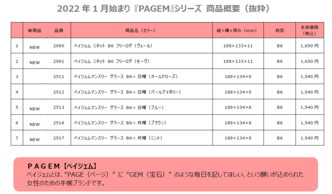 女性向けのカジュアル手帳ブランド『PAGEM(ペイジェム)』の2022年1月始まりの手帳全99アイテムを、全国の書店・文具店で順次発売します。