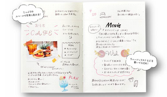 書くのは自分の好きなタイミングでOK!ノートとして使ったり、ウイッシュリストなど好きなことをリストアップしたり、いろいろな使い方ができる一冊です。