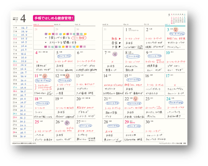 月間ページは、2つの予定・内容を書くことができる「ダブルマンスリー」のレイアウトになっているのが特徴です。マス目が大きいブロック型の月間ページにひと言日記や家計簿を、左側の縦型マンスリーに予定や健康管理の記録を書くなど、日々のさまざまなメモや記録を手軽に残せる一冊です。