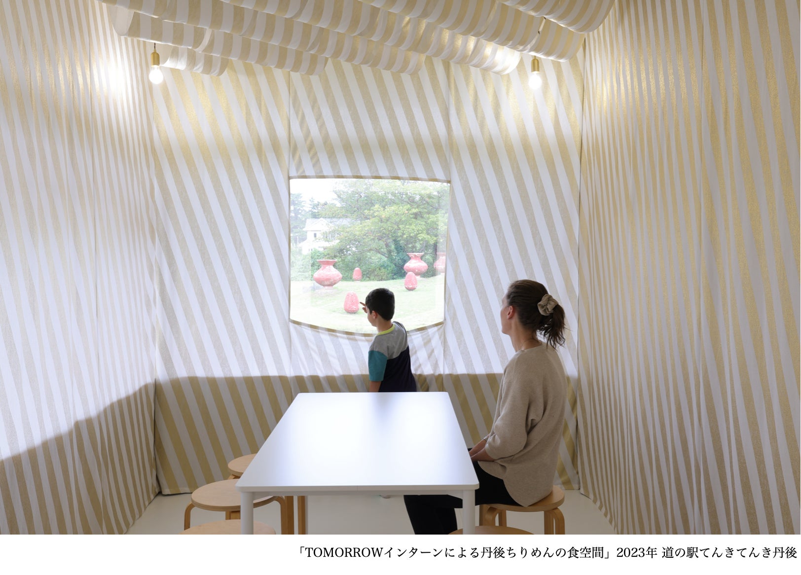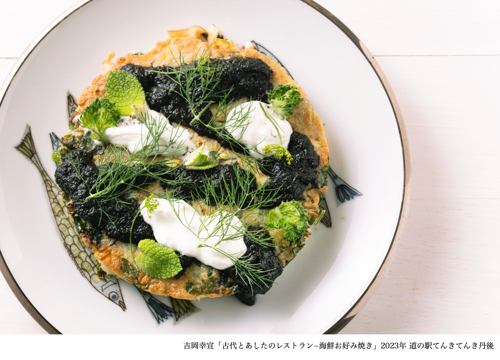 古代竹野遺跡の地から日本海を臨む道の駅では、京丹後の豊かな海産物を使い、国内外で活躍する料理人・坂本健(cenci)と吉岡幸宣(縄屋)が、身体にも美味しく、地元のあらたなソウルフードとなるようなレシピを監修します。「古代とあしたのレストラン」と題した限定メニューは、テキスタイルデザイナーの安東陽子が、TOMORROWインターンと共に構想した丹後織物による空間で、会期中お楽しみいただけます。