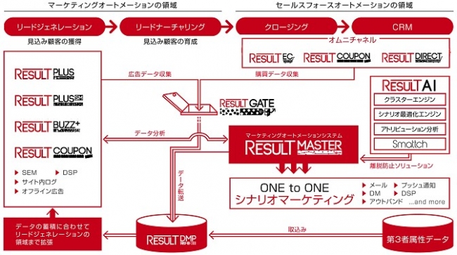 当社は自社で有しているRESULTシリーズを主体に、分析システム・顧客のCRMデータ、ノウハウを強みとして、マーケティング予算をお預かりし、企業様に対し新規顧客獲得・既存顧客の育成に重点を置いた集客~販促~顧客育成までの一貫したサービスの提案に積極的に取り組んでおります。