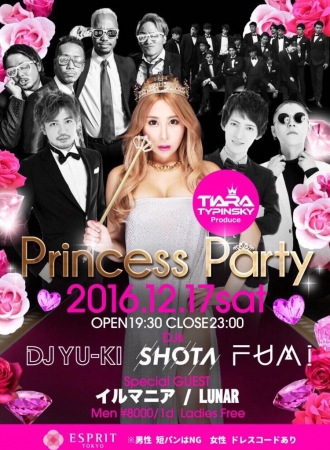 TIARA TYPINSKY 初の主催イベント「Princess Party」が12月17日六本木ESPRIT TOKYOにて開催!出演者は若手人気DJ,SHOTA,FUMI,DJ YU-KI、TV出演で話題のイルマニア、イケメン集団LUNARなど豪華ゲスト!!「女の子は誰でもプリンセス」をコンセプトに世界を見てきた彼女にしか出来ないイベントは必見。またクリスマスは12月23日大阪club JOULE,12月24日沖縄JAIL to GRIDに出演。来年のオファーも続々入っているという彼女のDJを見逃すな!!