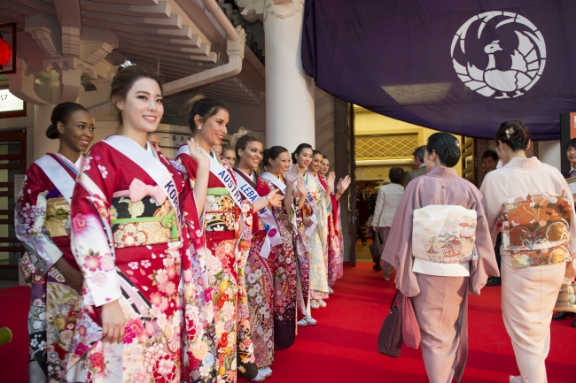 2015年11月5日(木)に開催される世界3大ビューティ・ページェントの1つである「2015ミス・インターナショナル世界大会」に向けて、国・地域の代表約70名の世界大会出場者達が10月17日(土)より日本国内で実施している親善活動の一環として、そのうち30名の出場者達が、株式会社鈴乃屋衣装提供による着物にてお客様をお出迎えしました。