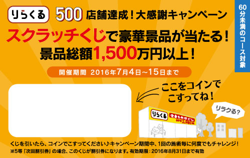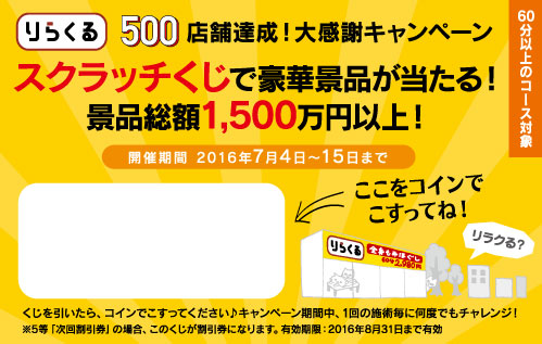 期間中、500店舗達成御礼、日頃のお客様への感謝を込めて、お客様への還元の気持ちを込めた、総額1500万相当の豪華店頭スクラッチくじキャンペーンを実施いたします。店頭にご来店のお客様もれ無く全員が対象となりますので、ぜひ期間中来店して、賞をゲットしてください。