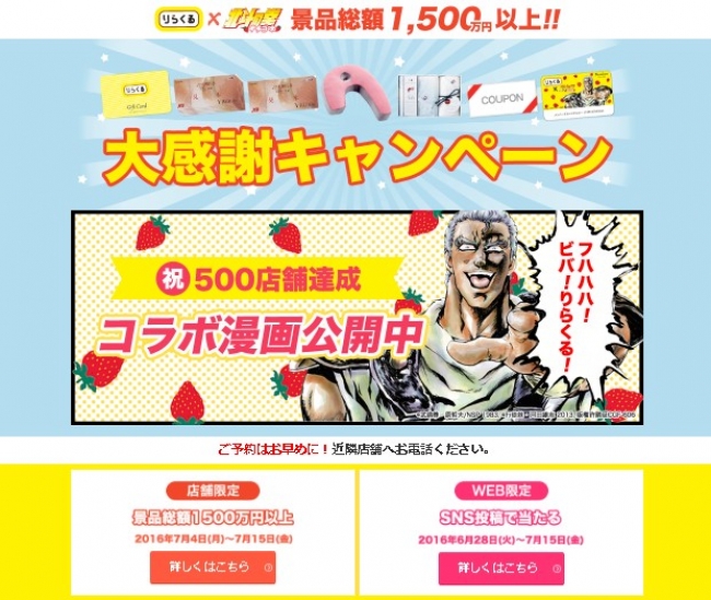 りらくる500店舗達成!大感謝キャンペーン4種を実施 「北斗の拳イチゴ味」とのコラボキャンペーンコンテンツ本日よりOPEN!2016年6月28日(火)~7月15日(金)