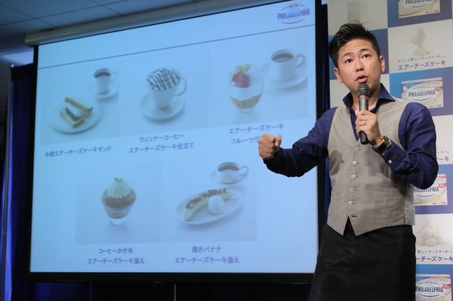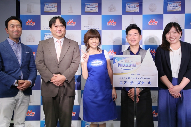 森永乳業は、7月27日(水)に新しい食べ方の提案のため「クラフト フィラデルフィアクリームチーズ」を使用した新食感「エアーチーズケーキ」の作り方とアレンジレシピを紹介するイベントをベクトルラウンジ(東京・港区)にて開催しました。また家庭だけでなく、お店でも楽しく「エアーチーズケーキ」を味わっていただくためにコラボーションが決定した企業と、8月1日(月)から提供が開始される限定メニューを発表しました。