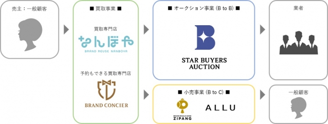 事業内容 :ブランド品・貴金属・骨とう品等の買取および販売(ブランド買取店「なんぼや」「BRAND CONCIER(ブランドコンシェル)」/B to Bオークション「STAR BUYERS AUCTION(スターバイヤーズオークション)」/B to Cブランド小売事業「ALLU(アリュー)」「ZIPANG(ジパング)」の展開、運営)