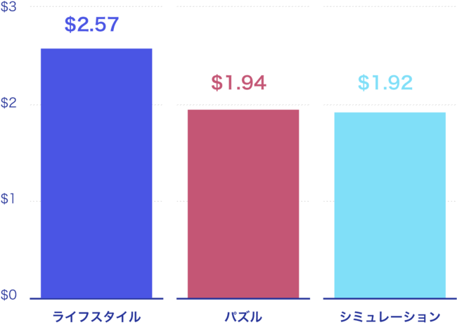 $2.57のコストを必要とするライフスタイルゲームは最も高額とはいえ、保持率の高いジャンルといえるでしょう。 パズルゲームは、容易なコンバージョンを創出するシンプルなゲームプレイおよび構造のこのジャンルにぴったりの$1.94という魅力的なCPIでした。