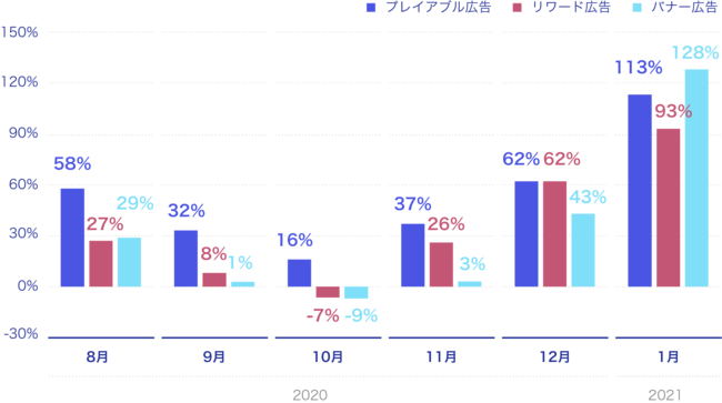 - IDFA 利用が制限され、新しい広告フォーマットが模索される中でプレイアブル広告の利用率が増加