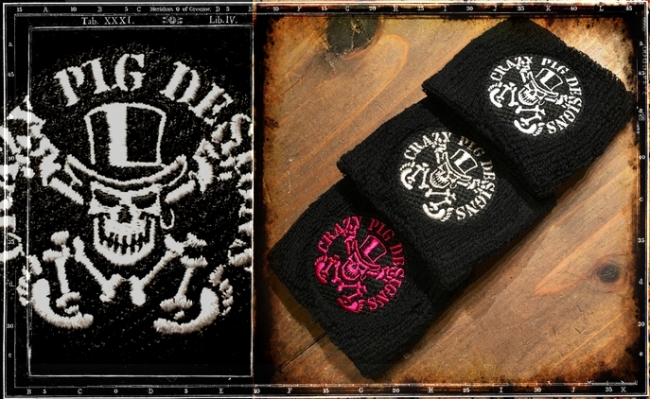 クレイジーピッグの印象的なロゴにもなっているマスコットキャラクターである、シルクハットをかぶったスカル「ゴメス」を高品質なブラックパイル地に刺繍したリストバンドは、クレイジーピッグの源流ともいえるロックミュージックの血潮を感じるさせるようなアイテムです。