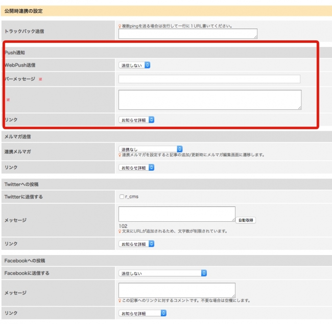 RCMSでは、従来より記事公開時の連携機能としてFacebook/Twitter/メルマガ/Pingを提供してきました。