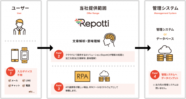 「Repotti」はユーザーが音声やテキストデータで入力されたコンテンツやデータをAIが解析し、お客様の業務管理システム等のデータベースにインプットするプロセスオートメーションソリューションです。労働人口減少や働き方改革が進んでいる中、企業や団体での業務効率化は最大のテーマとなっています。様々な業務管理システム等において、情報入力の時間は過多になっており、よりタイムリーに、より正確に、より簡単に入力できることが求められています。当社が開発した音声・テキスト解析AIプラットフォーム「Repotti」は、ユーザーが音声発信したデータの文章解析や意味理解を行い、あらゆる管理システムへインプットすることで、業務効率化や生産性向上に貢献いたします。
