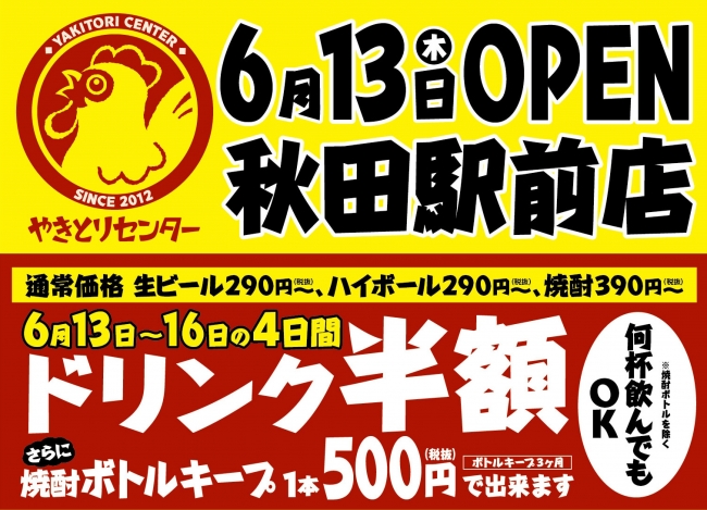 2019年6月13日(木)、秋田県秋田市に「やきとりセンター 秋田駅前店」としてオープンし、これによりコロワイドグループの「やきとりセンター」としては、43店舗目となります。