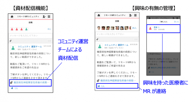 MCS内のクローズドなコミュニティ内に、「資材配信」機能と「医師薬剤師の興味の有無」を示す機能を実装しております。情報に興味を示した医師、薬剤師等に対してMR等*がコンタクトし、詳細な情報提供を行います。