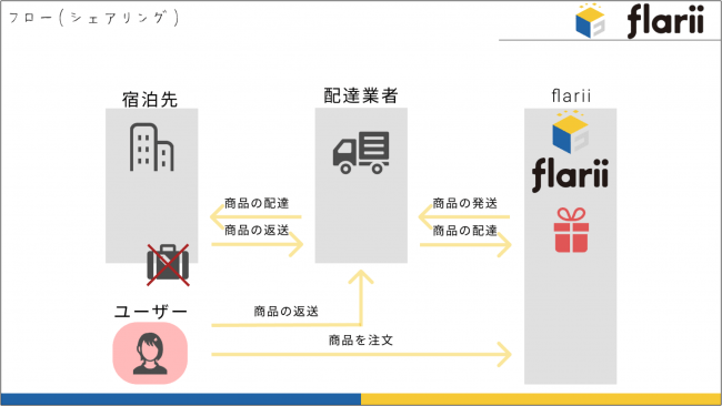 旅行者は、旅行先到着5日前に、①「flarii」上の「衣類」「日用品」「家電」「ゲーム/おもちゃ」「スポーツ」などの主なカテゴリー、レンタル用品・商品合計約150点の中から旅行先で必要な用品・商品(消耗品は購入可能)を選択、②ホテル、友人宅、実家など全国で配送が可能な届け先とレンタル料の支払い方法を入力するだけで、希望した用品・商品をまとめて配送し、受け取ることが可能です。③レンタルした用品・商品の使用後は、旅行先から指定された宛先へ返却(郵送)することで取引が終了となります。