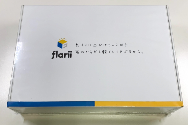 「flarii」で申し込んだ旅行レンタル用品・商品がまとめて梱包され発送、旅行宿泊先へと届けられる。(画像は試作版の箱)