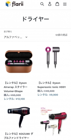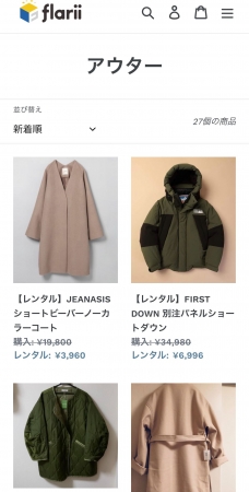 < 「flarii」のトップ画面と、一レンタル旅行用品・商品カテゴリー「衣類」画面 >