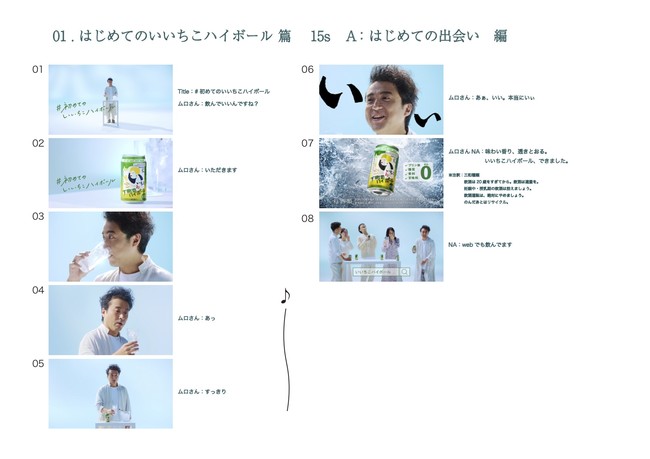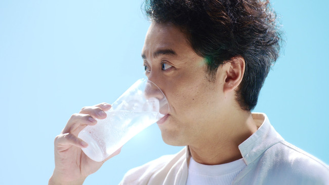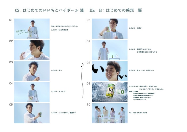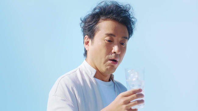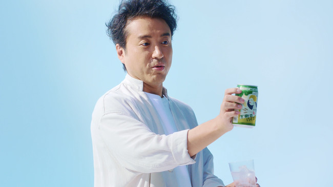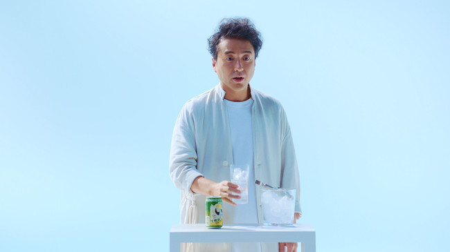 白い衣装に身を包んだムロツヨシさんが、テーブルに置かれた『いいちこ下町のハイボール』と初対面するシーンからスタート。「飲んでいいんですね?」と、新商品の試飲を待ちきれない様子のムロさん。「いただきます」と言いながら『いいちこ下町のハイボール』を、「カラン」という氷の涼しげな音とともにムロさんが一口味わいます。味を確かめたムロさんは「おっ!」「あ、スッキリ」と驚いた表情を一瞬見せたあと、途端に「あ〜いい、本当にいい!」と満面の笑みを浮かべます。台本なしで本当に初めて新商品を飲んだムロさんの“素”の感想が漏れ伝わるCMになっています。