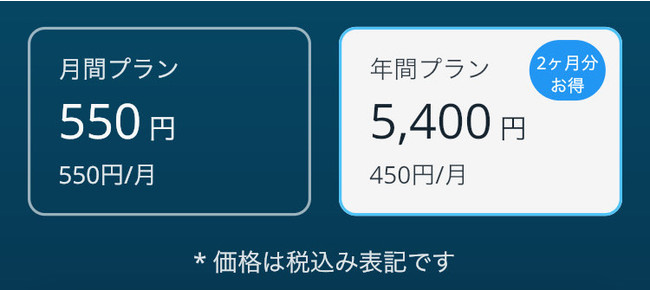 プレミアムプランには、課金開始までに7日間の無料トライアル期間(無料お試し期間)があります。無料トライアル期間終了後の料金体系には、月間550円(税込)もしくは、年間5400円(税込)プランの2つがあります。年間プランで加入いただくと、月額あたり450円となり月間プランと比較して約2ヶ月分お得になります。